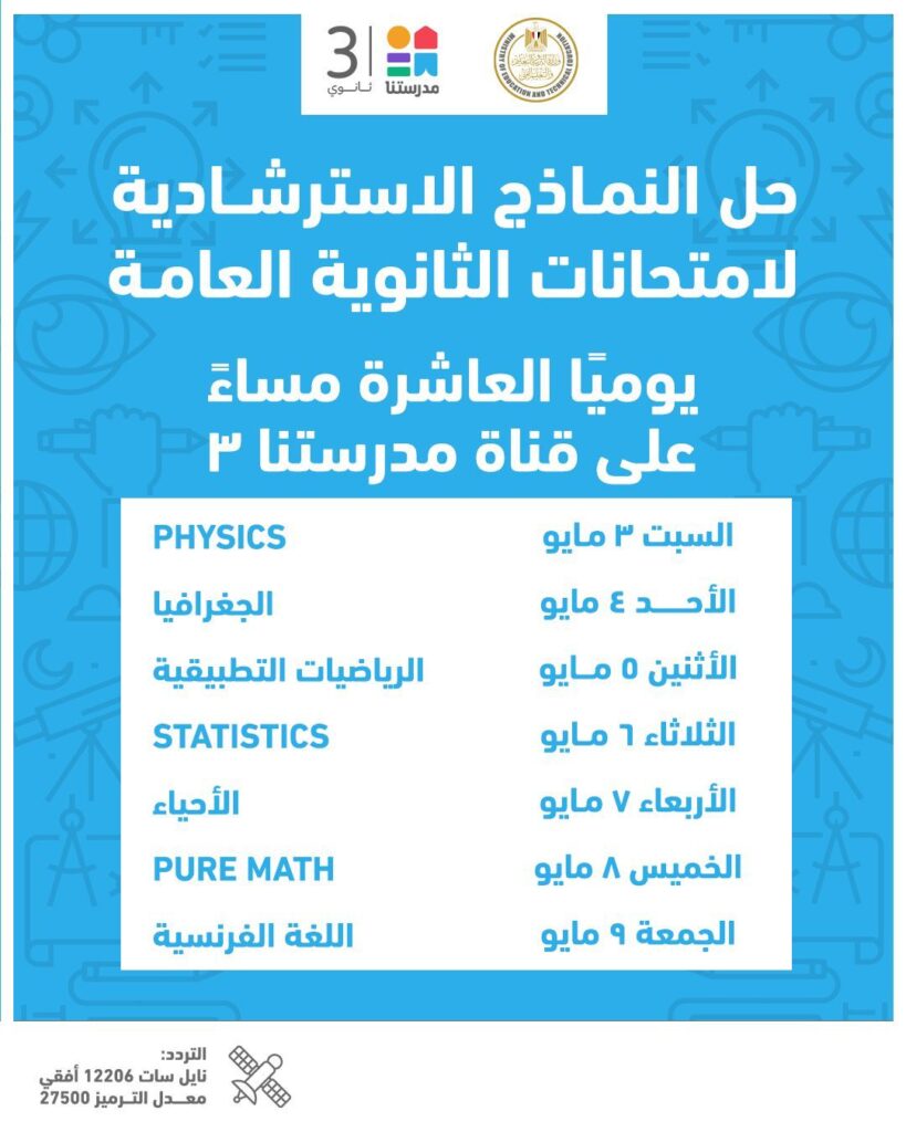 تقدم وزارة التربية والتعليم والتعليم الفني جدول مواعيد إتاحة النماذج الاسترشادية لامتحانات شهادة إتمام الثانوية العامة بداية من غدٍ السبت، وذلك عبر الموقع الرسمي للوزارة، كما يمكن متابعة حلها عبر قناة "مدرستنا ٣" يوميا فى تمام الساعة العاشرة مساء، على أن تكون الإعادة فى تمام الساعة العاشرة صباح اليوم التالي، وذلك عبر تردد القناة على النايل سات 12206 أُفقي معدل ترميز 27500.