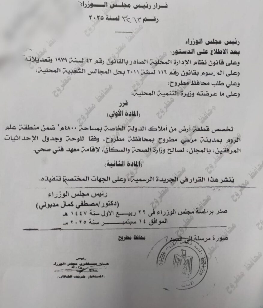أعلن اللواء خالد شعيب محافظ مطروح، عن صدور قرار الدكتور مصطفى مدبولي رئيس مجلس الوزراء، بالموافقة على تخصيص مساحة 4800 متر مربع في منطقة علم الروم شرق مدينة مرسى مطروح لصالح وزارة الصحة والسكان لإقامة معهد فنى صحى بالمحافظة.