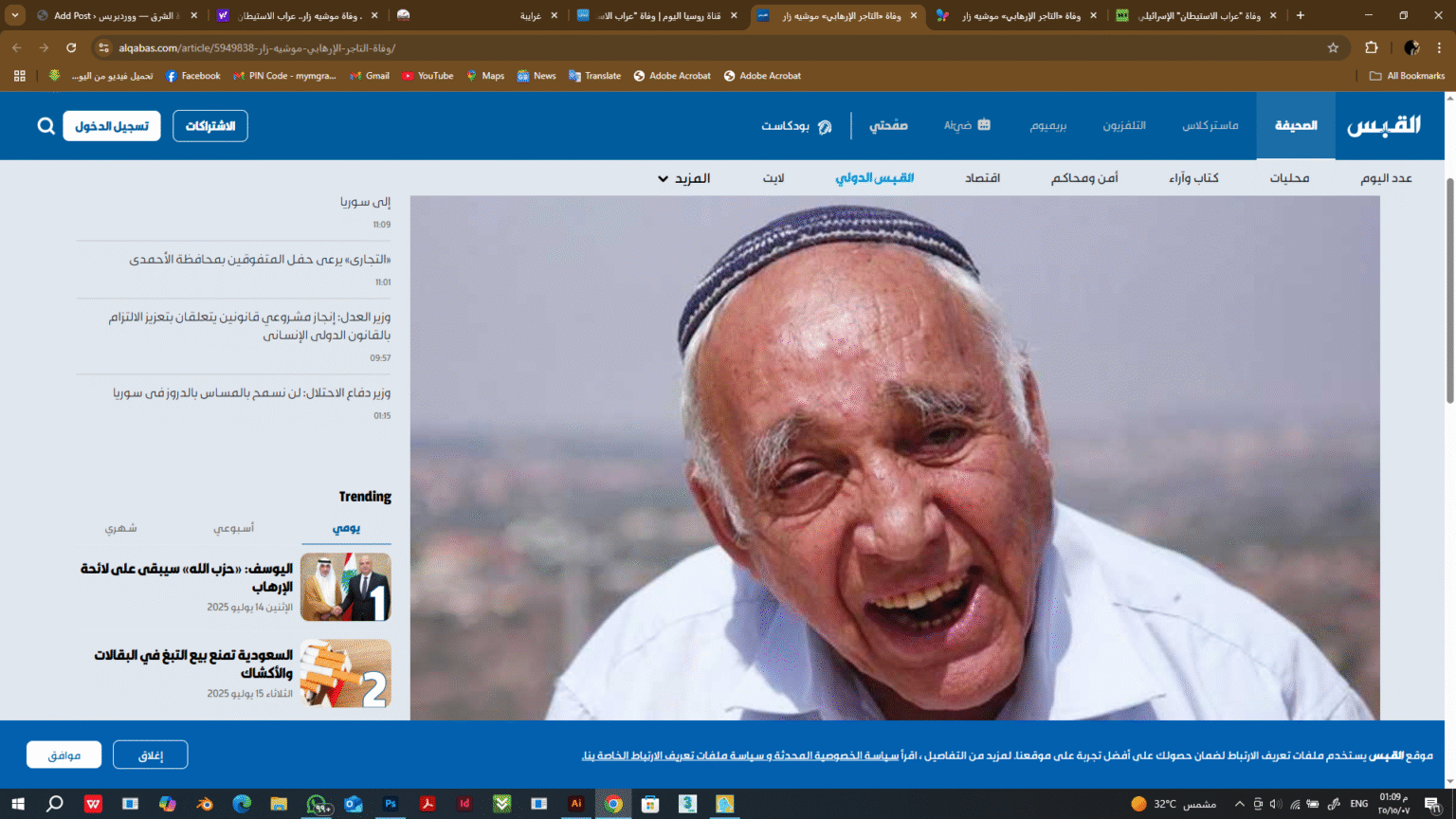 توفى موشيه زار، أحد أبرز قادة الحركة الاستيطانية الإسرائيلية، عن عمر ناهز 88 عام، بعد مسيرة حافلة بالجدل، عُرف خلالها بلقب "عراب الاستيطان"، نتيجة لدوره في الاستيلاء على آلاف الدونمات من أراضي الضفة الغربية وإنشاء مستوطنات إسرائيلية اعتُبرت غير قانونية بموجب القانون الدولي.